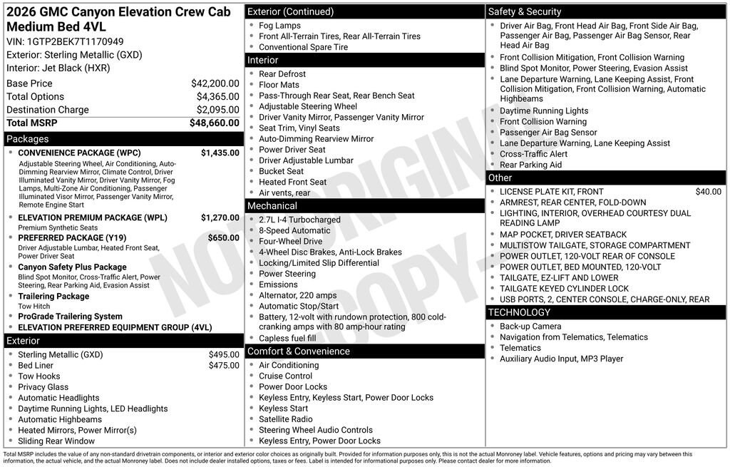 GMC helps you stay safely on the move with automatic braking, lane-keeping assistance, pedestrian/cyclist detection, an HD rearview camera, hill start assistance, tire pressure monitoring, and more. Our Canyon Elevation is driver-focused, so you can do more! Save this Page and Call for Availability. We Know You Will Enjoy Your Test Drive Towards Ownership! Price includes: $750 - Buick & GMC Consumer Cash Program. Exp. 04/30/2026