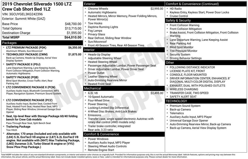 Our One Owner 2019 Chevrolet Silverado 1500 LTZ Crew Cab 4X4 with the Premium Pack provides premium features inside and out with a powerful Summit White design! Motivated by a 6.2 Liter EcoTec3 V8 that offers 420hp paired to a 10 Speed Automatic transmission with tow/haul mode for easier pulling. This Four Wheel Drive truck also raises the bar for capability with a heavy-duty auto-locking rear differential and an advanced trailering system, it sees nearly 20mpg on the highway. Standing strong, our Silverado has a purposeful look with LED lighting, fog lamps, chrome accents, heated power-folding mirrors, bold alloy wheels, a sunroof, and an EZ-Lift tailgate.