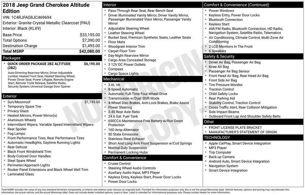 Why BUY from Gregg Young Chevy Omaha? When you choose this Granite Crystal Metallic Clearcoat 2018 Jeep Grand Cherokee Altitude with 125,186 miles, you are not just buying a used vehicle - you are investing in quality, reliability and peace of mind. Our clientele depend on us for Transparent Pricing, Convenience and, most importantly, Customer FIRST Service! All purchases include 5 year Complimentary Maintenance Package, valued at over $1,000! What this vehicle includes: Quick Order Package 2BZ Altitude ($6,195 value)Altitude IV PackageSecurity and Convenience GroupRear Fascia Black MIC Step PadRear View Auto Dim MirrorPower 8-Way Driver/manual Passenger SeatPower 4-Way Driver Lumbar AdjustBlack Suede Seats with Black StitchingDark Lens TaillampsJeep Black Gloss BadgingGloss Black Rear Fascia AppliqueBody Color FasciaDark Headlamp Bezel FinishAltitude GrilleFront Accent/body Color FasciaRear Accent/body Color FasciaDark Day Light Opening MoldingsBody Color CladdingsDelete Laredo BadgeSingle Exhaust with Bright TipSteering Wheel Mounted Audio ControlsBody Color Shark Fin AntennaSiriusXM Satellite RadioUconnect 4C Navigation Radio with 8.4" Display20" X 8.0" Gloss Black Aluminum Wheels1-Year SiriusXM Radio ServiceSecurity and Convenience Group115V Auxiliary Power OutletHeated Front SeatsPower LiftgateSecurity AlarmHeated Steering WheelRemote Start SystemUniversal Garage Door Opener Comfort Heated steering wheel - A warm touch. Trying to drive with bulky winter gloves on isn't always easy. Keep your hands warm in cold temperatures so you can ditch the mitts and get a firm grip with this heated steering wheel.Convenience Power open and close liftgate - On-demand access. When your arms are full of cargo, the last thing you want to do is set it all down just to open the liftgate, then pick it all back up to load it in. By remotely opening and closing, power liftgate lets you skip straight to the loading. It also eliminates the awkward stretch to reach up for the liftgate to close it. Load and go with power open and close liftgate. Keyfob engine start control - Get an early start. Remotely start your vehicle's engine from the key fob, ensuring your ride is ready to go when you get in. Now you can stay comfortable inside while your vehicle gets comfortable outside, thanks to Keyfob engine start control.Technology and Telematics Smart device mirroring - Smartphone, meet smart car. You can control your device through your vehicle's infotainment system. Smart device mirroring brings together safety and convenience by making it easier to find what you're looking for while keeping your eyes on the road. Voice activated integrated navigation system - A to B made easy! Whether it's an errand or a road trip, the voice activated integrated navigation system will guide you to your destination. No more bulky, impossible-to-fold maps, and no more stopping to ask for directions. Just tell it where you want to go, and the voice activated integrated navigation system shows you the right way. ENGINE: 3.6L V6 24V VVT UPG I W/ESS, TRANSMISSION: 8-SPEED AUTOMATIC (850RE), QUICK ORDER PACKAGE 2BZ ALTITUDE, TIRES: 265/50R20 BSW A/S LRR, GRANITE CRYSTAL METALLIC CLEARCOAT, BLACK, BLACK SUEDE SEATS W/BLACK STITCHING, 18" STEEL COMPACT SPARE WHEEL, POWER SUNROOF, FRONT LICENSE PLATE BRACKET, MANUFACTURER'S STATEMENT OF ORIGIN When you choose a Certified Pre-Owned vehicle from Gregg Young, youre not just buying a used car youre getting extra protection, added peace of mind, and built-in value you wont find with an ordinary pre-owned vehicle. Every Certified Pre-Owned vehicle must pass an extensive 172-point inspection performed by trained technicians. From engine and transmission performance to interior quality, safety features, and road-test standards, we verify the vehicle meets strict certification requirements before it ever reaches our lot. Ask if this vehicle qualifies for our Certified Pre-Owned Program 12-Month / 12,000-Mile Premier Coverage Drive con