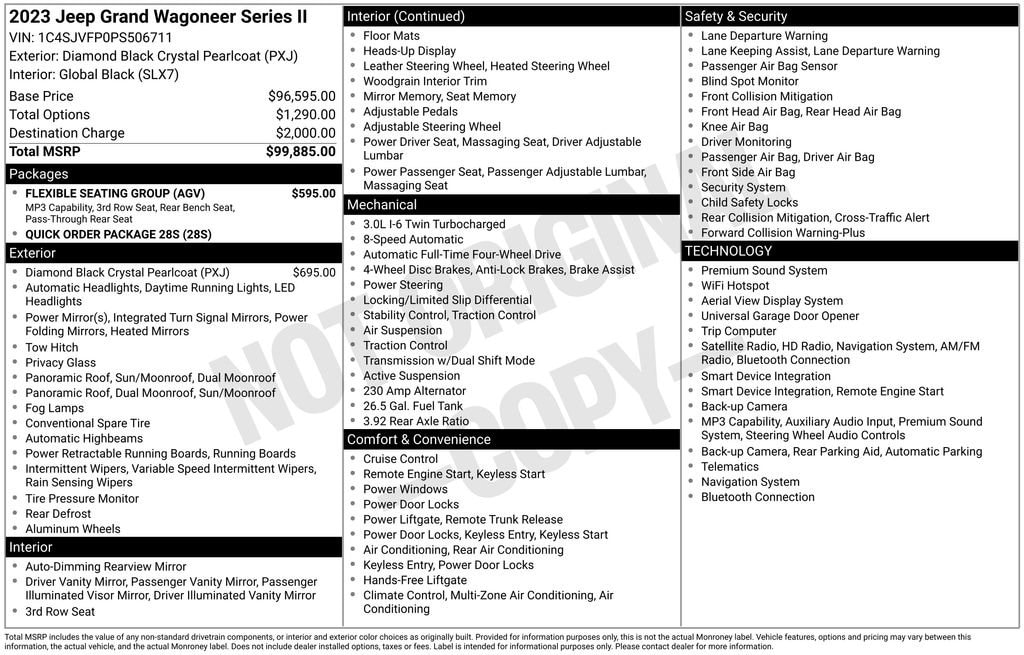 Our luxurious One Owner, Accident Free 2023 Jeep Grand Wagoneer Series II 4X4 rides with an inspiring Diamond Black Crystal Pearlcoat design! Motivated by a Twin-TurboCharged 3.0 Liter Hurricane 6 Cylinder providing 510hp to an 8 Speed Automatic transmission. This Four Wheel Drive SUV also shows off iconic off-road performance and returns nearly 20mpg on the highway. Our Grand Wagoneer grabs attention with LED lighting, fog lamps, a tri-pane sunroof, a hands-free tailgate, huge 22-inch wheels, power running boards, and roof rails.